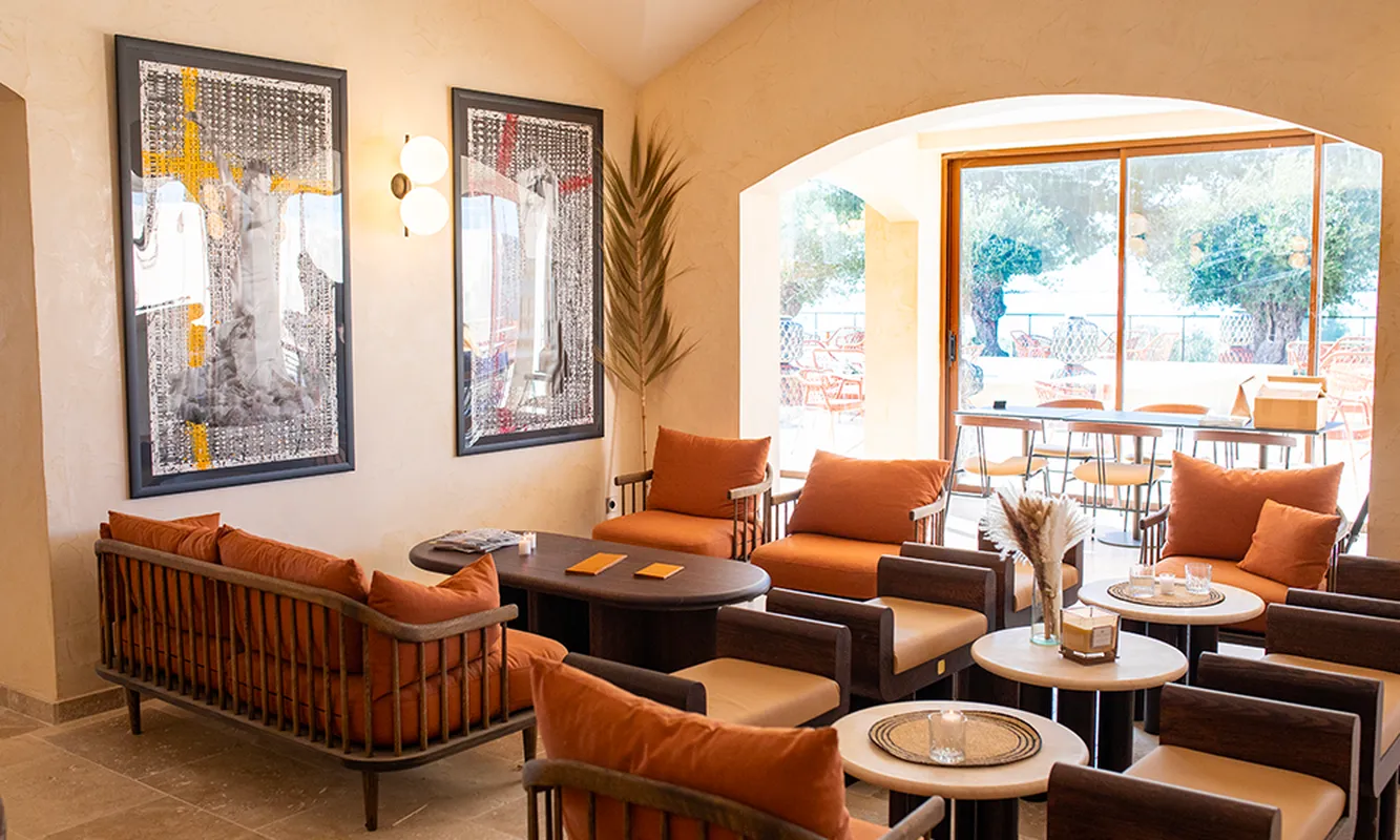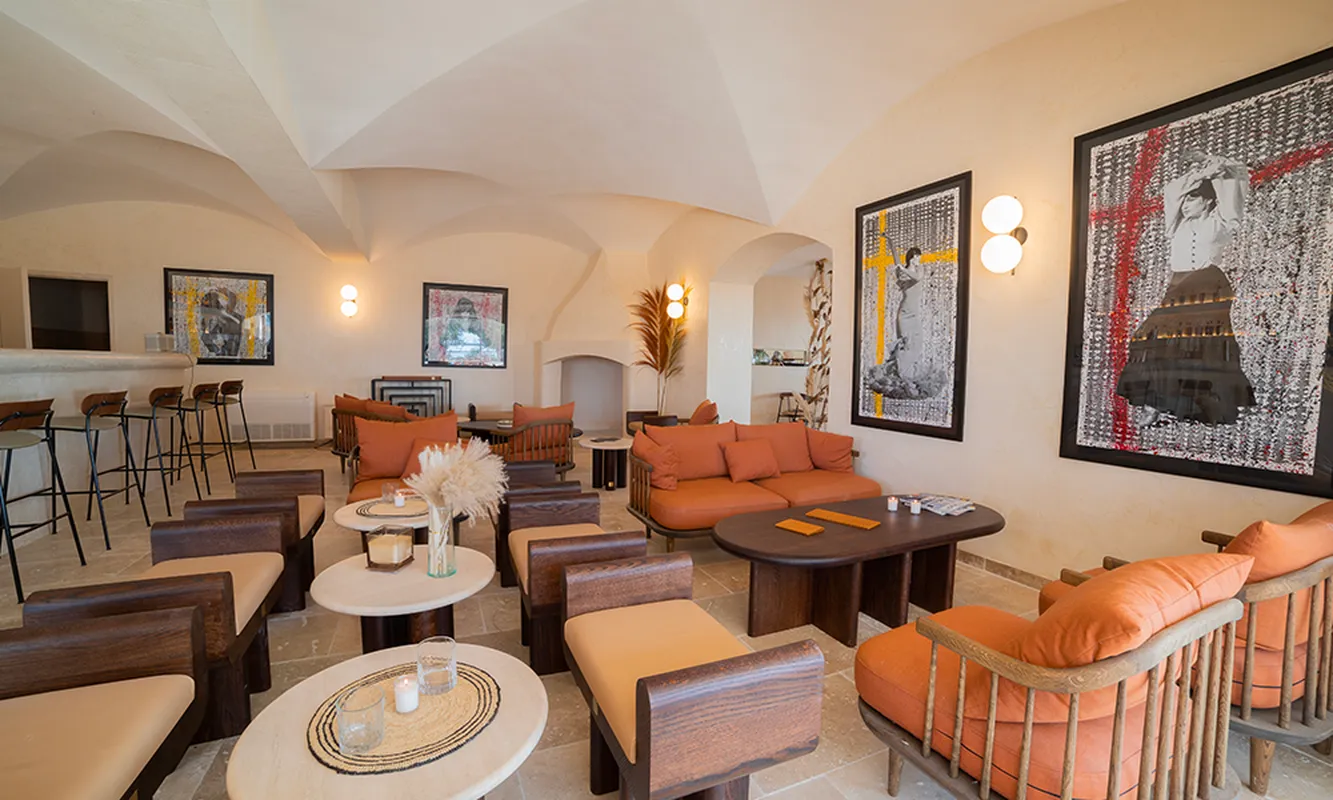 Le bar en enduit naturel, pièce maîtresse de l’espace, est sublimé par une suspension végétale spectaculaire. Autour de lui, des mange-debout élégants, une cheminée contemporaine et un coin salon aux assises confortables composent un décor doux et enveloppant, baigné d’une lumière tamisée.
